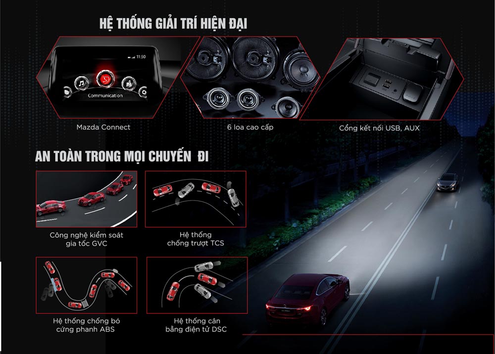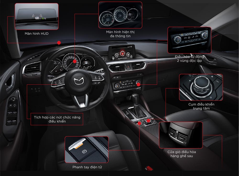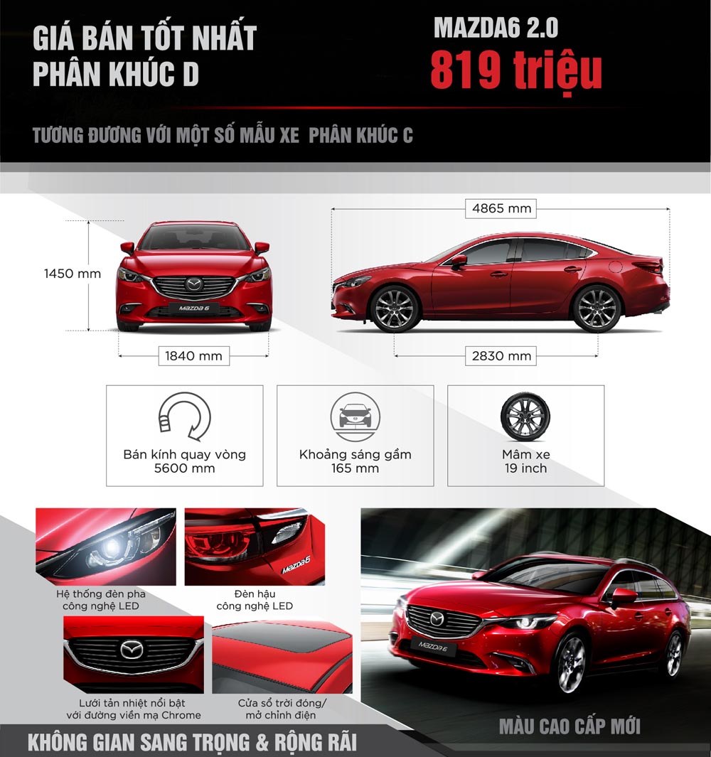 Mazda6 sở hữu những trang bị tiện nghi vượt trội như hệ thống đèn pha công nghệ LED, cửa sổ trời, phanh tay điện tử, màn hình giải trí DVD,…Không chỉ có giá bán tốt, Mazda6 còn được yêu thích nhờ sở hữu kích thước tổng thể dài x rộng x cao đạt 4.865 x 1.840 x 1.450 mm, chiều dài cơ sở 2.830 mm, khoảng sáng gầm xe 165 mm. Với những thông số này, mẫu sedan của Mazda sở hữu không gian nội thất rộng rãi nhất nhì phân khúc, phù hợp cho những chuyến đi của cả gia đình.