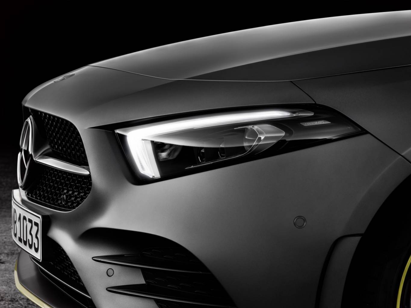 Bắt đầu với những trang bị ngoại thất, A-Class hoàn toàn mới sở hữu hệ thống đèn pha với 3 bóng có kích thước giảm dần đều khi tiến vào giữa. Đi kèm là hệ thống đèn ban ngày LED. Trục cơ sở của xe cũng được nối dài và chắc chắn hơn. Trong khi đó, phần đầu xe với nắp capo được tăng độ dốc làm cho chiếc xe càng ra dáng vẻ thể thao hơn rất nhiều.