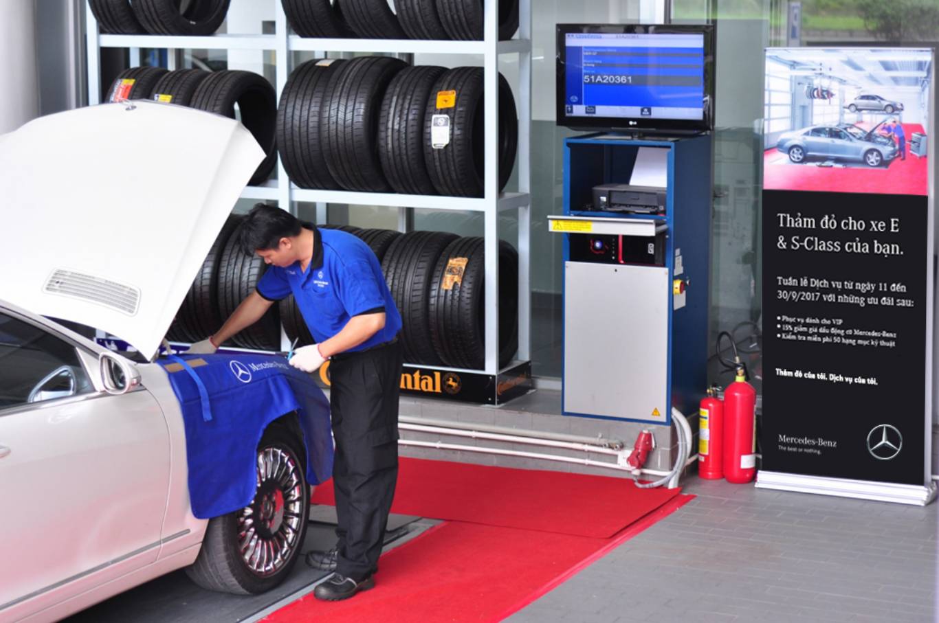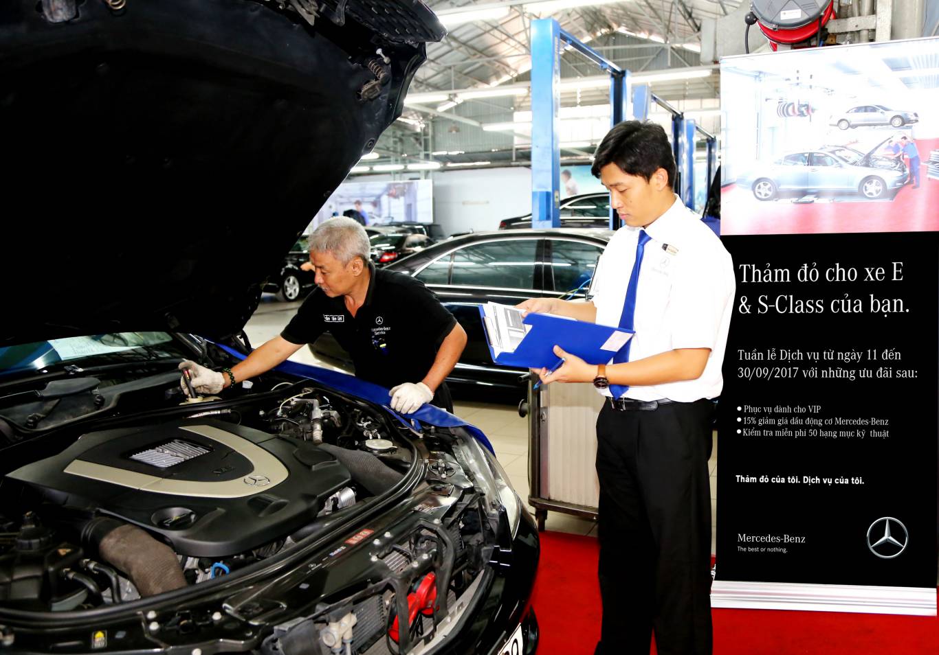 Cụ thể, từ ngày 11-30/9/2017, khi ghé thăm và sử dụng dịch vụ tại các đại lý ủy quyền của MBV trên toàn quốc, khách hàng sở hữu các mẫu sedan cỡ trung E-Class và cỡ lớn S-Class của “Ngôi sao ba cánh” sẽ được trải nghiệm tiện ích và dịch vụ 5 sao cùng những ưu đãi đặc biệt. Bên cạnh kiểm tra miễn phí đến 50 hạng mục kỹ thuật, MBV áp dụng 15% ưu đãi cho khách hàng đối với phụ tùng, dầu động cơ chính hãng.Ngoài ra, khách hàng sẽ nhận được quà tặng là 1 chiếc dù Mercedes-Benz phong cách (*). Chương trình dự kiến sẽ thu hút hơn 1000 lượt xe tham gia.