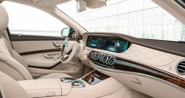 Nội thất của Mercedes-Maybach tràn ngập chất liệu da và gỗ thượng hạng. Tất cả các phiên bản đều sử dụng ghế da designo Nappa hoặc Nappa. Bảng điều khiển trung tâm gắn đồng hồ cơ học phong cách cổ điển, chế tác bởi hãng đồng hồ danh tiếng IWC. Hệ thống âm thanh vòm Burmester high-end 3D 24 loa, công suất 1.540 Watt sẽ tiếp tục xuất hiện trên tất cả phiên bản. Cửa sổ trời siêu rộng với kính đổi màu Magic Sky Control nhiều khả năng sẽ tiếp tục xuất hiện trên 2 phiên bản Mercedes-Maybach S400 và S500.