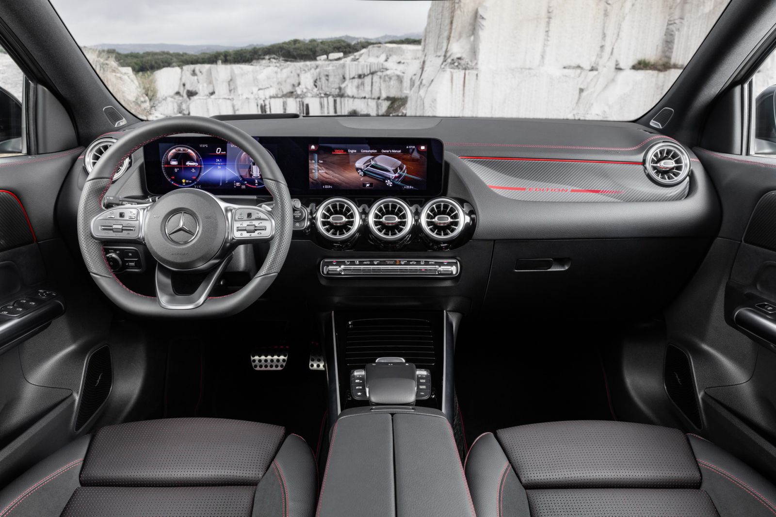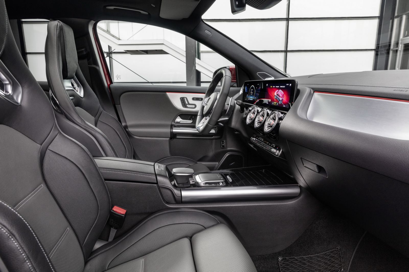 Bên trong, Mercedes-AMG GLA 35 sở hữu hệ thống thông tin giải trí MBUX, màn hình kỹ thuật số với tính năng thể thao. Khoang cabin có ghế thể thao bọc Artico/microfiber Dinamica, dây an toàn màu đỏ, vô lăng thể thao đa chức năng AMG bọc da Nappa, cac` chi tiết trang trí bằng sợi carbon, bàn đạp thể thao bằng thép không gỉ và một loạt các điểm nhấn màu đỏ.