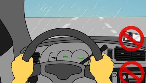 Khi lái xe dưới trời mưa, đặc biệt là mưa to, bạn đừng để bị phân tâm bởi điện thoại hay hệ thống giải trí. Hãy tắt chúng đi. Quan sát 360 độ, tập trung nhìn về phía trước, liếc qua gương chiếu hậu trong và ngoài xe để dễ dàng quan sát những gì xảy ra xung quanh bất ngờ, như đống bùn đất phía trước, cây hay cột điện đổ, dây điện bị đứt hoặc bắt đầu đi vào vùng nguy hiểm.