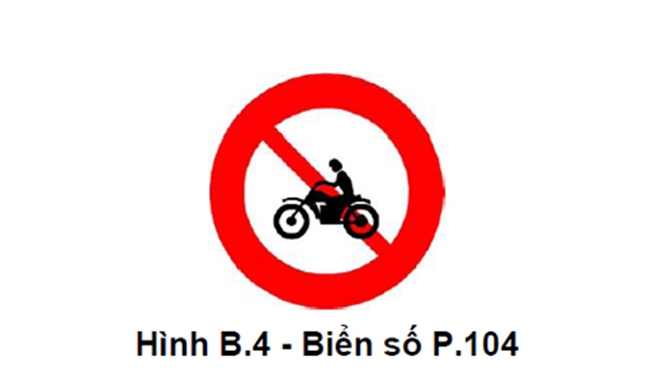 Biển P.104 báo đường cấm tất cả các loại xe môtô đi qua, trừ các xe môtô được ưu tiên theo luật định. Biển không có giá trị cấm những người dắt xe máy.