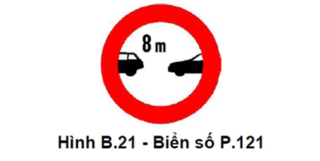 Biển P.121 báo xe ôtô phải đi cách nhau một khoảng tối thiểu. Số ghi trên biển cho biết khoảng cách tối thiểu tính bằng mét. Biển có hiệu lực cấm các xe ôtô đi cách nhau một cự ly nhỏ hơn trị số ghi trên biển báo, kể cả các xe được ưu tiên theo luật lệ nhà nước quy định.