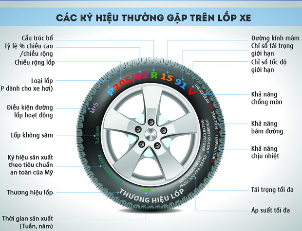 Trên thành lốp thường có rất nhiều chữ và số thể hiện kích thước và chủng loại lốp. Ví dụ, trên lốp có dòng chữ, số P215/65R17, thì chữ P là viết tắt của “Passenger Vehicle”, tức là xe con 7 chỗ trở xuống. Nếu chữ P thay bằng LT, tức là lốp dành cho xe việt dã hạng nhẹ (Light Truck). Nếu chữ P thay bằng chữ C (Commercial) đây là loại lốp chuyên dùng cho xe dịch vụ chuyển hàng thương mại hoặc những chiếc xe tải hàng nặng.