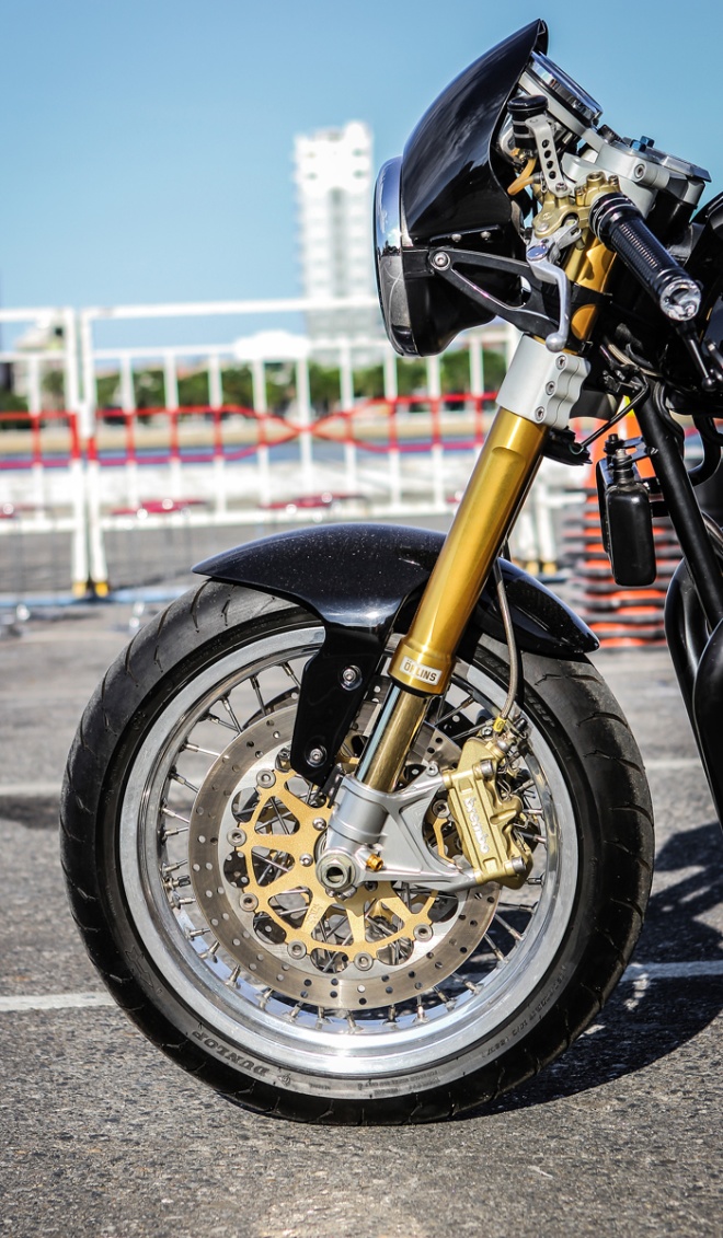 Cặp phuộc nhún của Ohlins với nước sơn màu vàng, giảm xóc hành trình ngược, đường kính 43 mm và có thể điều chỉnh được độ nhạy.