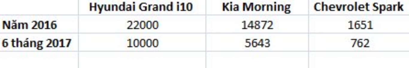 Phân khúc xe hạng A tại Việt Nam hiện có 3 thương hiệu nhận được sự quan tâm của nhiều khách hàng. Đó là Hyundai Grand i10, Kia Morning và Chevrolet Spark. Trong số đó, 2 thương hiệu đến từ Hàn Quốc là Hyundai Grand i10, Kia Morning đang chiếm thế thượng phong, còn Chevrolet Spark tụt lại khá xa.