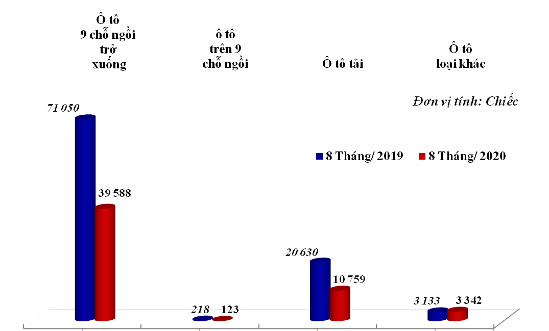 Cộng dồn, 8 tháng đầu năm 2020, lượng ô tô nguyên chiếc các loại đạt 53.812 chiếc, giảm 44,3% so với cùng kỳ năm trước. Trong đó, ô tô 9 chỗ ngồi trở xuống chiếm 39.588 chiếc, giảm 46,9%; ô tô vận tải là 10.759 chiếc, giảm 47,8%.