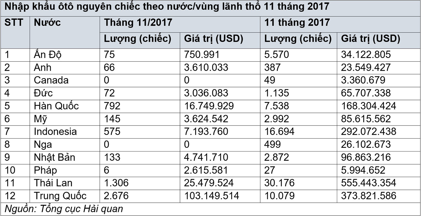Báo cáo của Tổng cục Hải quan cũng cho biết, cộng dồn 11 tháng năm 2017, tổng lượng ôtô CBU nhập khẩu từ Thái Lan và Indonesia đã đạt 46.870 chiếc, vượt rất xa so với con số 31.148 chiếc được nhập khẩu từ toàn bộ 10 nước và vùng lãnh thổ còn lại mà Việt Nam đang nhập khẩu xe CBU.