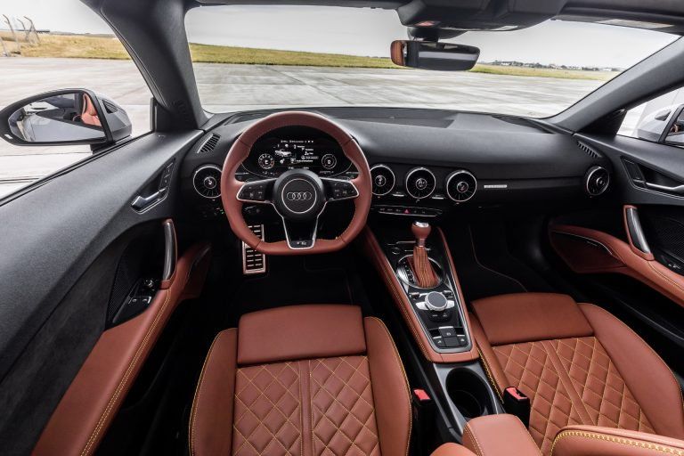 Khoang nội thất của Audi TT 20th Anniversary 2019 đều được bọc da Moccasin Brown Nappa màu nâu kết hợp với chỉ khâu tương phản màu vàng nổi bật. Xe sở hữu các ghế ngồi S thể thao và tất cả các nâng cấp mới nhất từ phiên bản Audi TT 2019 facelift, bao gồm cả hộp đựng điện thoại theo tiêu chuẩn tích hợp sạc không dây và tăng cường tín hiệu.