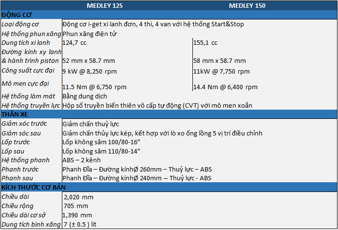 Piaggio Medley 2020 tiếp tục được trang bị động cơ i-get 125 và 150cc 4 thì, 4 van phun xăng điện tử và làm mát bằng dung dịch. Hệ thống phun xăng điện tử và hệ thống làm mát bằng dung dịch có khả năng tối đa hóa hiệu suất đồng thời giảm thiểu lượng tiêu thụ nhiên liệu và khí thải, khởi động êm ái nhẹ nhàng cho mọi chuyến đi.