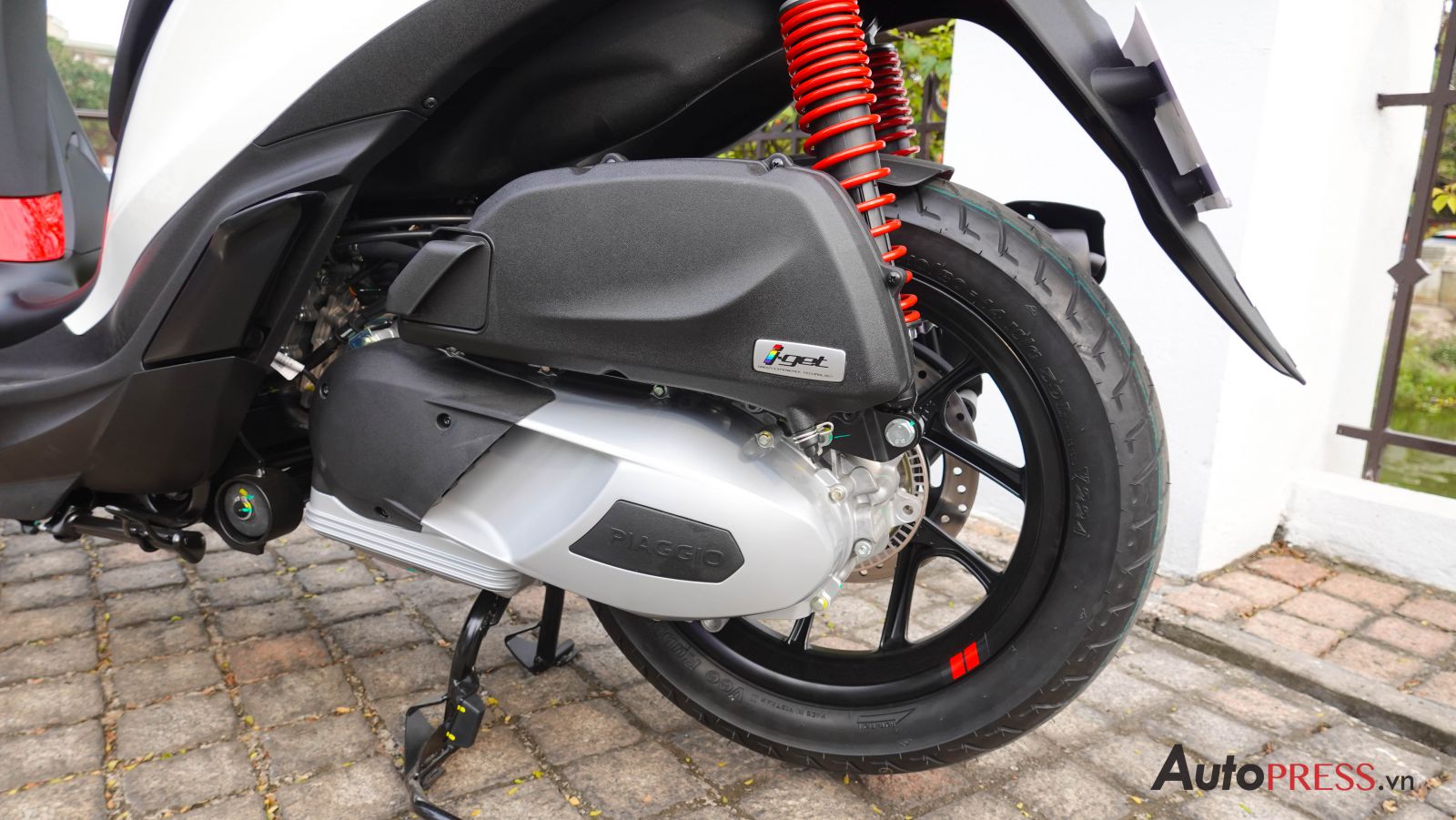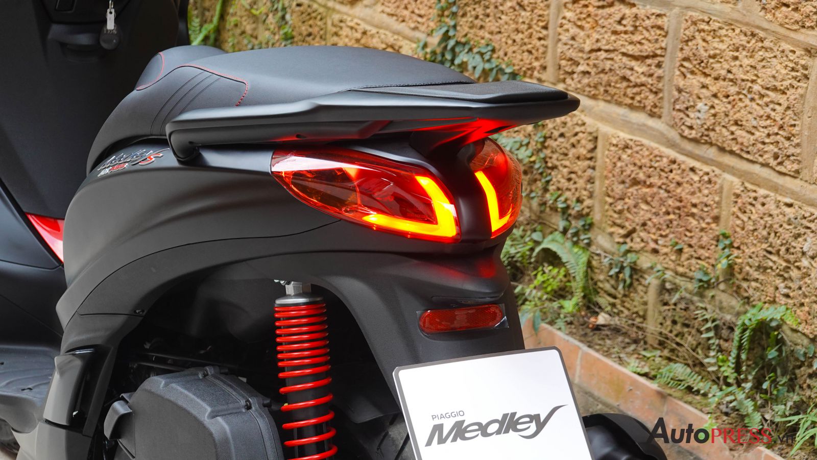 Trên phiên bản Medley S thể thao, ngàm phanh được sơn vàng và đĩa phanh tạo hình sóng cá tính kết hợp hài hòa với vành xe 5 chấu sơn đen nhám thể thao, nhấn nhá thêm các chi tiết sơn đỏ nổi bật ở giảm xóc, tem trên vành xe, viền crome đỏ trên cà vạt, đường chỉ đỏ ở yên xe tạo nên thiết kế tổng thể hài hòa đầy cá tính cho Medley S 2020.