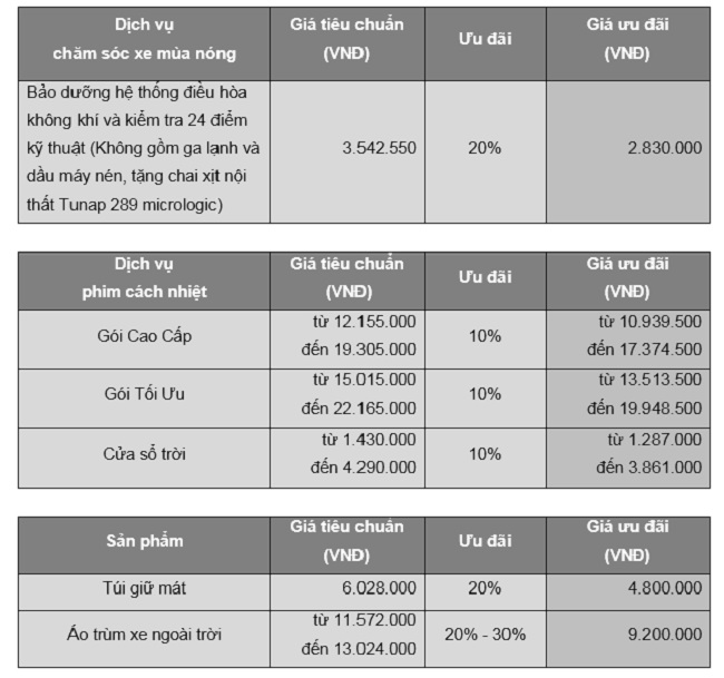 Bảng giá ưu đãi cho các gói dịch vụ và sản phẩm chăm sóc xe mùa nóng (đã bao gồm 10% thuế GTGT):