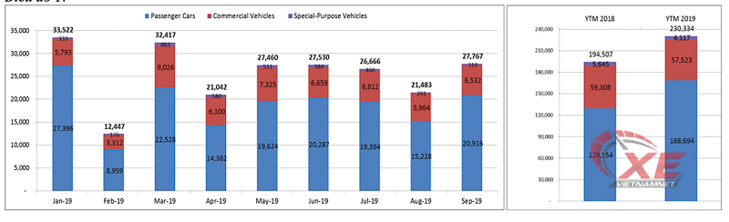 Theo báo cáo bán hàng từ VAMA (Hiệp hội các nhà sản xuất ô tô Việt Nam), lượng xe tiêu thụ của toàn thị trường (trừ TC Motor, Mercedes-Benz Việt Nam và Vinfast) trong tháng 9/2019 vừa qua là 27.767 chiếc, tăng 29% so với tháng trước đó và tăng 11% so với cùng kỳ năm ngoái. Trong đó, doanh số xe du lịch tăng 37%; xe thương mại tăng 10% và xe chuyên dụng tăng 10% so với tháng trước.