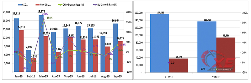 Tuy nhiên, tính đến hết tháng 9/2019, doanh số bán hàng của xe lắp ráp trong nước giảm 13% tương ứng 136.738 xe, trong khi xe nhập khẩu tăng 150%, đạt con số 93.596 xe so với cùng kì năm ngoái.