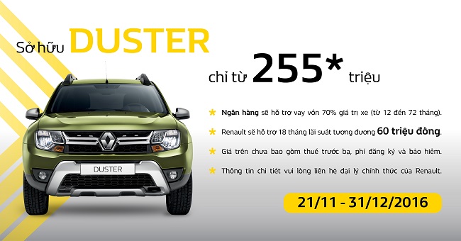 Từ ngày 21/11/2016 đến ngày 31/12/2016, chỉ từ 255 triệu đồng khách hàng sẽ sở hữu ngay xe Renault Duster tương đương 30% giá trị xe, 70% còn lại ngân hàng sẽ hỗ trợ (từ 12 đến 72 tháng). Renault sẽ hỗ trợ 18 tháng lãi suất tương đương 60 triệu đồng. Giá trên chưa bao gồm thuế trước bạ, phí đăng kí và bảo hiểm. Đối với khách hàng không mua qua ngân hàng sẽ được giảm trực tiếp 60 triệu đồng trên giá trị xe.