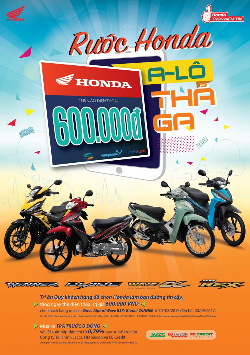 Bên cạnh đó, khách hàng còn có cơ hội mua xe Honda Wave Alpha, Blade, Wave RSX và WINNER trả góp với chính sách hấp dẫn từ công ty tài chính Jaccs, HD Saison & FE Credit tại các HEAD của Honda trên toàn quốc: