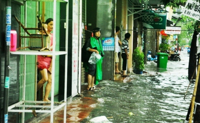 Khu dân cư trong các con hẻm đường Bạch Đằng ngập nước. Cuộc sống sinh hoạt của người dân bị đảo lộn.