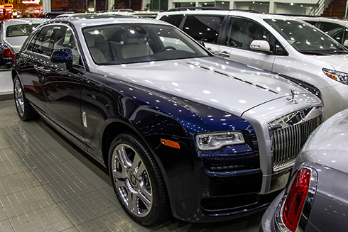 Rolls-Royce Ghost Series II mới nhập về Viêt Nam “khoác áo” xanh dương đậm và phối cùng màu bạc trải dài từ nắp ca-pô đến cốp sau. So với thế hệ trước, thay đổi lớn nhất của Ghost nằm ở hình dáng đèn pha dạng LED với dải đèn ban ngày bao xung quanh.