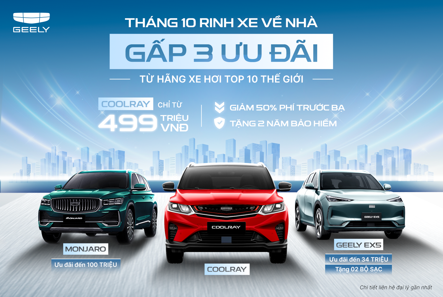 Thứ tư 22/10/2025 11:55 GMT+7Bộ 3 ưu đãi của Geely Việt Nam áp dụng với toàn bộ 03 mẫu xe của Geely trên thị trường, bao gồm Coolray, Monjaro và EX5. Đây là mức ưu đãi tốt trong giai đoạn bước vào Quý 4 và là thời điểm phù hợp để khách hàng sở hữu xe mới phục vụ nhu cầu đi lại tăng cao vào dịp cuối năm.