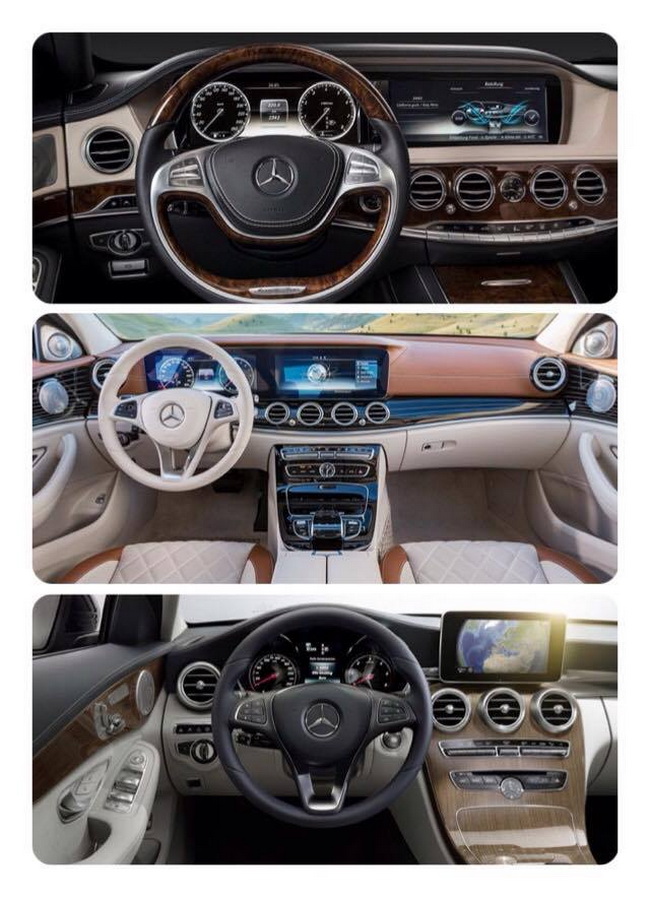 Phần nội thất của 2 dòng C-Class và E-Class đều được thừa hưởng từ dòng S-Class. Nhưng dòng C-Class thì có cụm đồng hồ truyền thống với màn hình đơn kiểu máy tính bảng, còn dòng S-Class và E-Class được trang bị 2 màn hình cỡ lớn cho cụm điều khiển trung tâm và hiển thị thông tin giải trí.