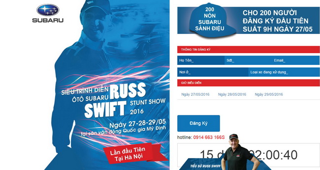 Lần đầu tiên tại Hà Nội, ngày hội Siêu trình diễn ô tô Subaru Russ Swift 2016 sẽ được tổ chức liên tiếp trong 03 ngày, 27 – 28 – 29 tháng 05 năm 2016 tại sân vận động Quốc gia Mỹ Đình. Khán giả Hà Nội sẽ có cơ hội chiêm ngưỡng những pha trình diễn ô tô mạo hiểm đẳng cấp và thót tim của Kỷ lục gia Guinness thế giới người Anh Russ Swift.