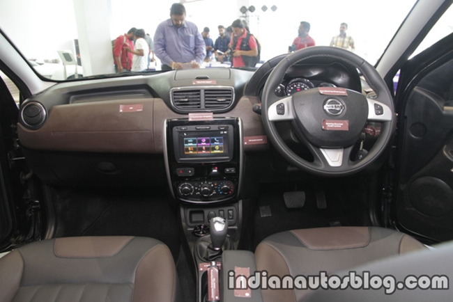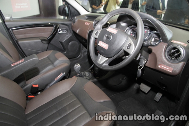 Bên trong Nissan Terrano 2017 tại Ấn Độ là nội thất bọc da/nỉ 2 màu đen phối nâu.