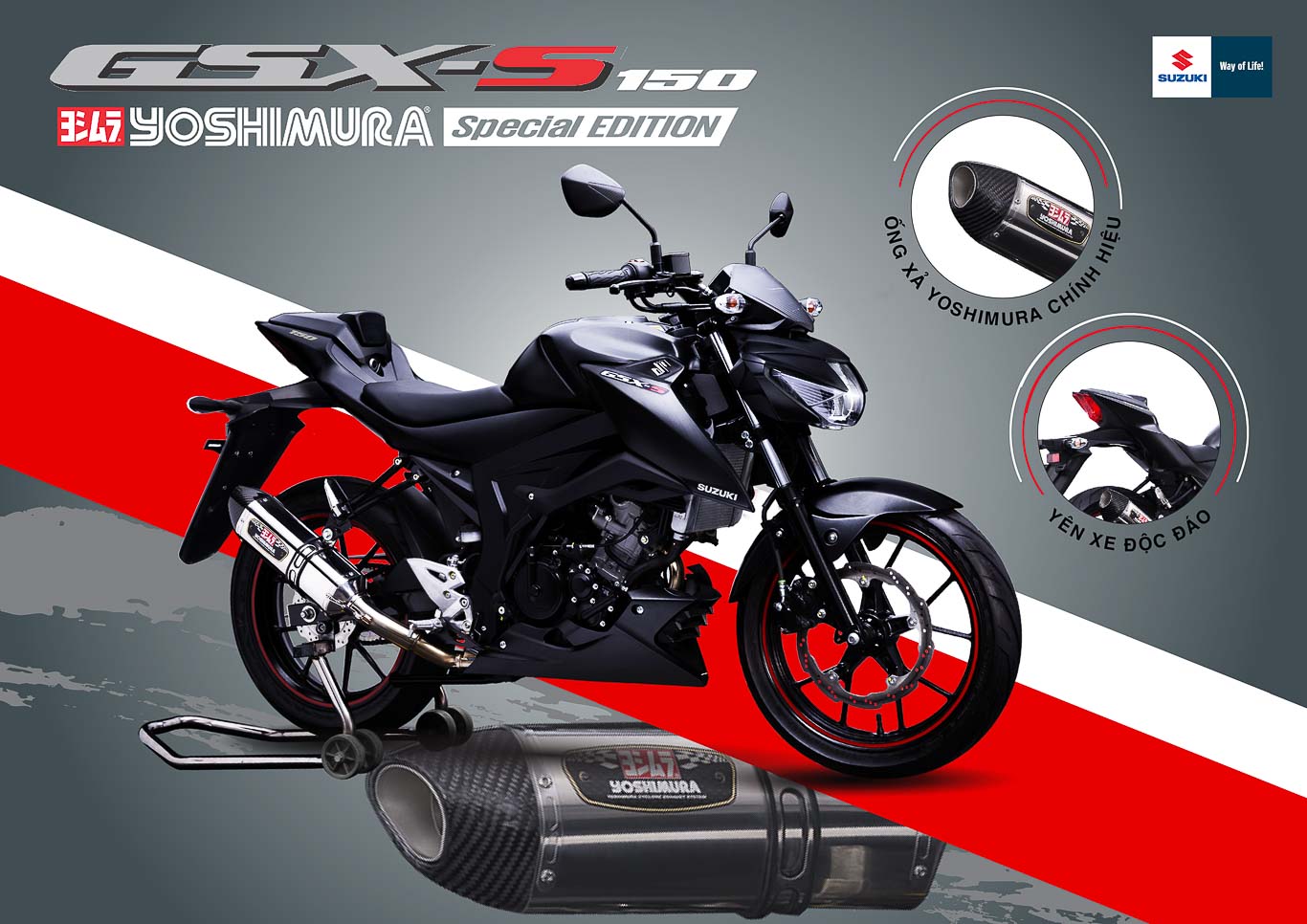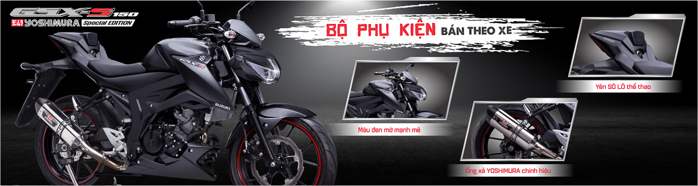 Nếu Suzuki GSX-S150 phiên bản thường vẫn chưa đủ thuyết phục thì phiên bản đặc biệt GSX-S150 Yoshimura là một lựa chọn không thể hấp dẫn hơn. Bộ phụ kiện Yoshimura như “bùa yêu” mang thêm sự hấp dẫn , mạnh mẽ cho chiến mã GSX-S150. Giờ đây, những khách hàng yêu thích phong thái của GSX-S150 nhưng “thèm muốn” hiệu suất và thứ âm thanh đầy kích thích của ống xả Yoshimura từng có mặt trên GSX-R150 đã có thể hài lòng.