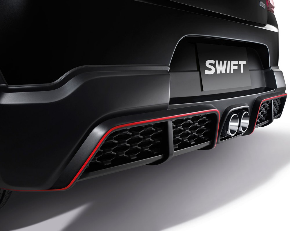 Bộ body kit chính hãng dành cho Suzuki Swift GL Plus 2021 bao gồm cánh lướt gió trên đầu xe, nối liền với ốp cua lốp màu đen, thanh ba-bô-lê bên sườn, cánh gió sau được thiết kế dưới dạng bộ khuếch tán gió, cánh gió mui tích hợp đèn phanh thứ ba, ăng-ten hình vây cá trên nóc, bộ đề-can mới và 2 đầu ống xả giả chỉ có tác dụng trang trí.