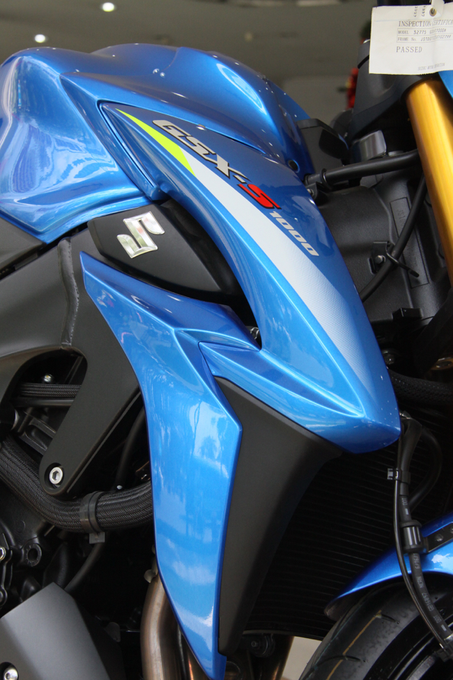 GSX-S1000 thừa hưởng những ưu điểm dựa trên chiếc Super Sport Suzuki GSX-R1000 như thiết kế khung sườn và bốn động cơ thẳng hàng, thế ngồi của GSX-S1000 mới thoải mái hơn. Như có thể thấy trên hình, GSX-S1000 có thiết kế góc cạnh đặc trưng của đàn em Suzuki GSR 750 nhưng trông ấn tượng và cơ bắp hơn.