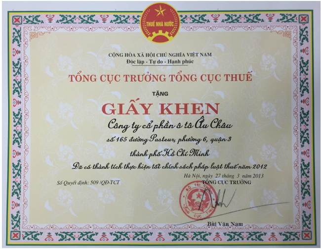 Bằng khen do tổng cục thuế trao tặng cho Euro Auto