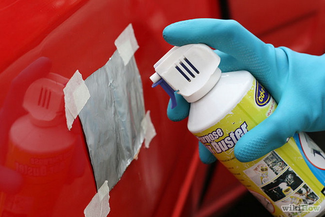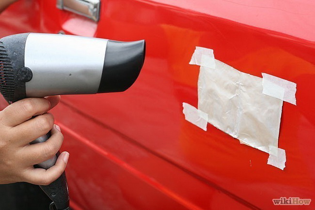 Bước 2: Sử dụng máy sấy tóc (ở độ nóng mức trung bình và cách xa khoảng 13 - 18cm) làm nóng vùng lõm khoảng 1 - 2 phút. (Bước này bạn đừng sợ bị hư màu sơn vì đã được miếng nhôm che chắn nên nhiệt không có tác dụng trực tiếp lên bề mặt sơn).
