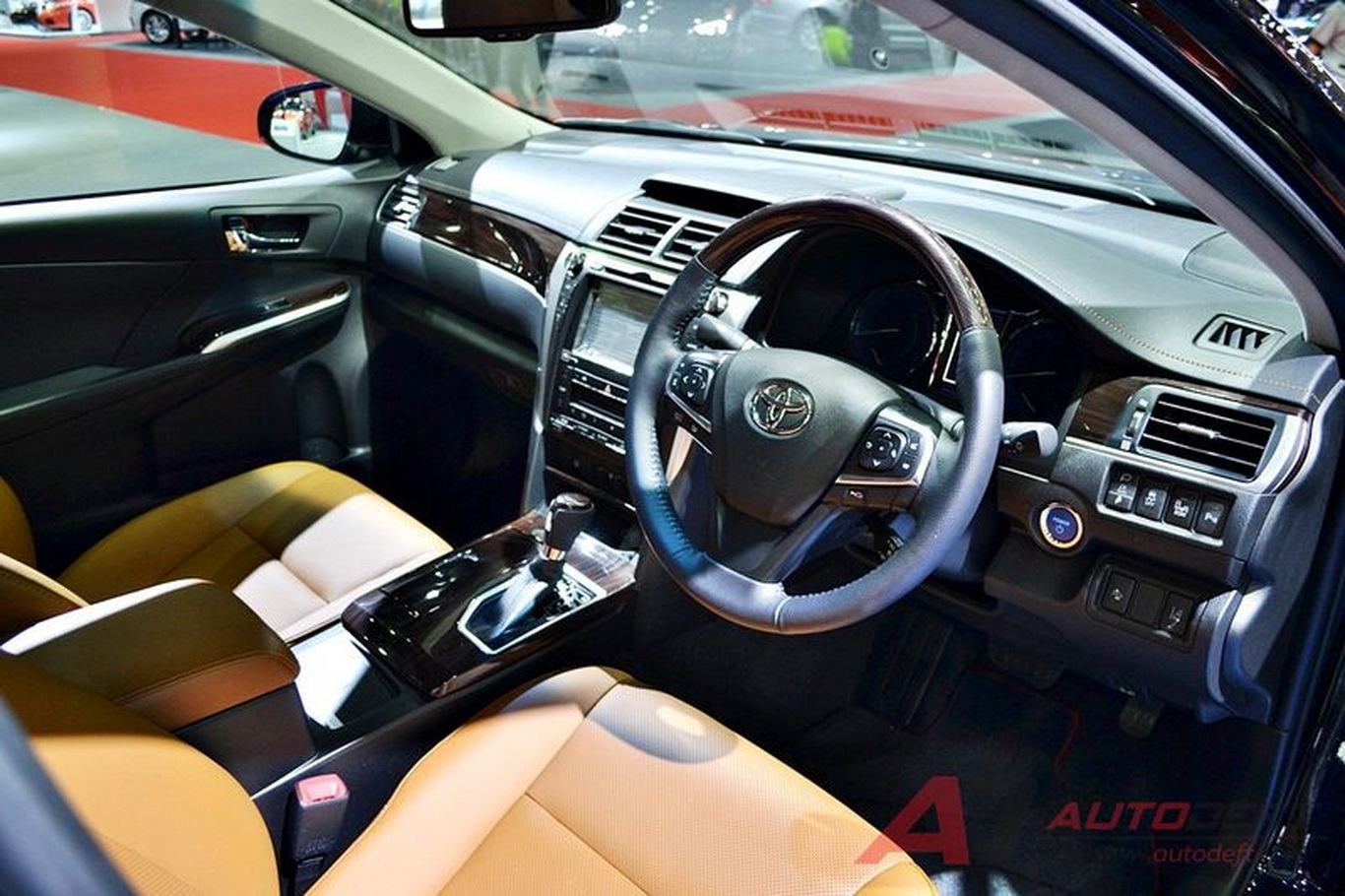 Nội thất bên trong không có nhiều thay đổi đặc sắc mà Toyota chỉ bổ sung thêm “gam” màu mới cho chiếc Camry 2017 này. Những trang bị nổi thật khi bước vào nội thất chiếc xe gồm vô- lăng thể thao 3 chấu bọc da, màn hình 4,2 inch trong cụm đồng hồ, cụm điều khiển trung tâm tái thiết kế, đầu đĩa DVD, hệ thống định vị, cổng USB và dàn âm thanh JBL 12 loa, sặc không dây, cần gạt nước tự động cùng các chi tiết ốp gỗ hoặc sợi carbon.