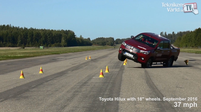 Theo đoạn video trên, Hilux 2016 đã "suýt bị lật" khi tham gia thử nghiệm tránh chướng ngại vật ở vận tốc chỉ 37 dặm/h (khoảng 60 km/h).