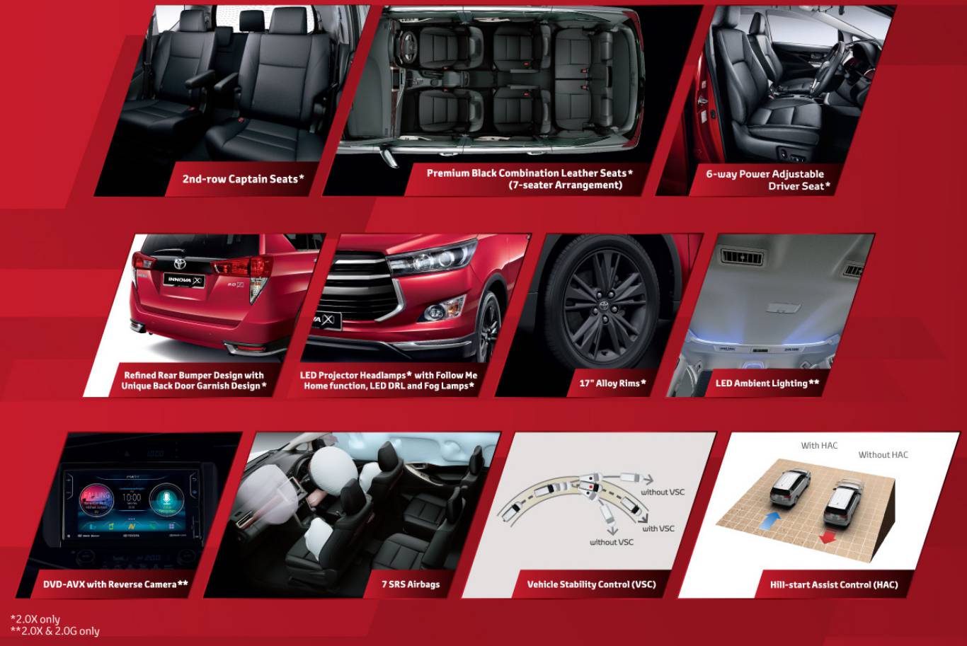 Đèn pha LED thay thế đèn halogen, và có dải đèn chạy ban ngày LED và đèn sương mù LED. Ở bên trong là bao gồm hai ghế đơn ở hàng thứ hai, thay thế cho băng ghế chuẩn. Điều này làm Innova biến thành một chiếc xe hơi MPV 6 chỗ ngồi, bỏ bớt 1 chỗ ngồi để đổi lấy sự thoải mái hơn. Nội thất của 2,0X được bọc bằng da màu đen kết hợp cũng như ghế lái có thể điều chỉnh 6 hướng.