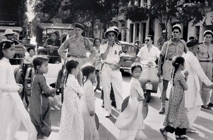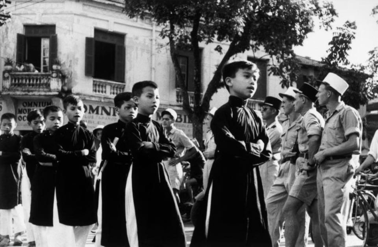 Trên đường phố Hà Nội, những em học sinh mặc trang phục truyền thống khoanh tay cảm ơn mọi người trong khi đi qua đường. Đây là những bức ảnh cuối cùng trong sự nghiệp của nhiếp ảnh gia Robert Capa, vài ngày trước khi ông mất vì bẫy mìn chiến tranh…