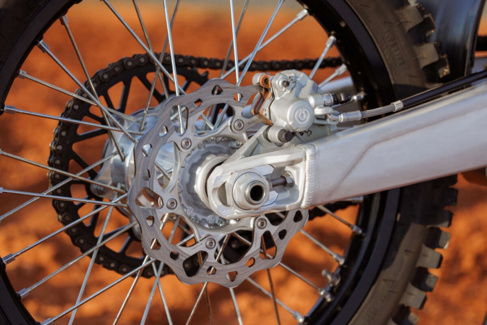 Với động cơ và hộp số 5 cấp được đặt trong khung nhôm, Triumph TF 250-X 2024 chỉ nặng 104 kg với 7 lít xăng trong bình. Chiều cao cố định của TF 250-X là 960 mm và chiều rộng tay lái 836 mm giúp người lái kiểm soát TF250-X. Hệ thống treo KYB phía trước và phía sau, trong đó phuộc trước 310 mm lò xo cuộn với khả năng điều chỉnh độ nén và phục hồi.
