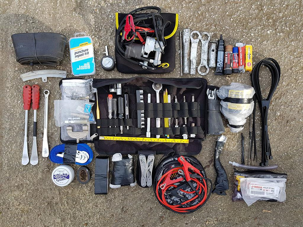 Tuy không phải là thợ chuyên nghiệp nhưng bạn cũng nên mang theo túi dụng cụ để thao tác những việc đơn giản như vặn lại ốc, thay đèn, bu-gi, cầu chì. Khuyến cáo: bạn nên dự phòng đèn chiếu sáng, bu-gi và cầu chì để phòng trường hợp những bộ phận đó bị hỏng ở nơi hoang vắng. Việc thay những bộ phận này cũng khá đơn giản nên bạn có thể tự làm. Ngoài ra, trong đoàn nên có người mang theo bơm hơi để xử lý các vấn đề liên quan tới lốp xe. Ảnh: Mad.