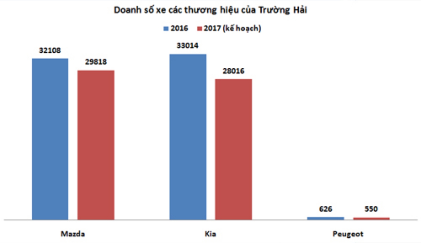 Theo đó, dự định 3 thương hiệu Mazda, Kia và Peugeot sẽ bán tổng số 58.384 xe trong năm 2017, với Kia 28.016 xe, Mazda 29.818 xe và Peugeot 550 xe. Cả 3 thương hiệu đều giảm lượng bán, giảm sâu nhất là Kia.
