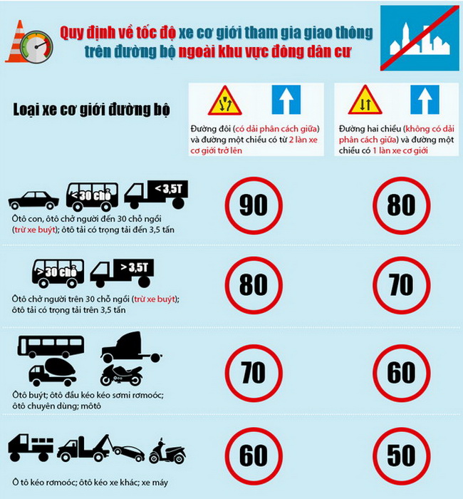 - Khi ra ngoài khu vực đông dân cư, các xe ô tô con, xe ô tô chở người đến 30 chỗ (trừ xe buýt), ô tô tải có tải trọng đến 3,5 tấn được phép chạy tốc độ tối đa 90 km/h trên đường đôi, có dải phân cách giữa và đường một chiều có từ 2 làn xe cơ giới trở lên. Còn ở đường hai chiều không có dải phân cách giữa hoặc đường một chiều có một làn xe cơ giới thì tốc độ tối đa cho phép là 80 km/h.