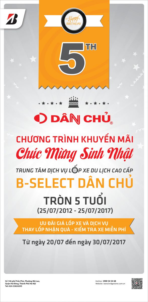 Nhân kỉ niệm sinh nhật lần thứ 5 của B-select Dân Chủ, khách hàng sẽ có cơ hội nhận được nhiều ưu đãi hấp dẫn trong suốt 10 ngày, từ 20/07 đến 30/07/2017. Đây là hoạt động nhằm tri ân sự ủng hộ của khách hàng trong suốt thời gian qua dành cho B-select Dân Chủ và hãng lốp Bridgestone.