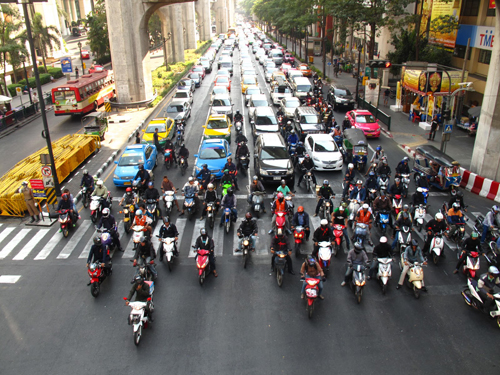 Giờ cao điểm, đường phố Bangkok nhồi kín bởi 8 làn xe, có thể tắc tới 2-4 giờ đồng hồ. Từng hàng xe di chuyển chậm chạp theo đúng làn đường, hiếm hoi lắm mới có một vài chiếc xe máy hoặc tuk tuk vội vàng lấn làn sau khi phát tín hiệu xin vượt. Ngoài tiếng động cơ xe, tuyệt nhiên không có một tiếng còi.