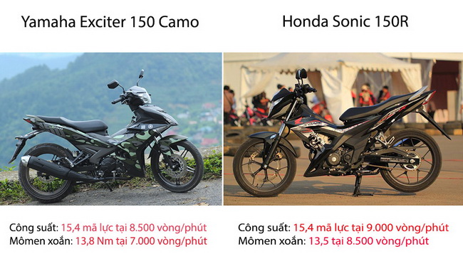 Honda Sonic 150R là phiên bản hồi sinh của chiếc Sonic thế hệ đầu với động cơ 148.2cc, DOHC tạo ra công suất 15.4 mã lực, mô-men xoắn đạt mức 13.5 Nm tại vòng tua 8500vòng/phút. Còn Yamaha Exciter 150 sử dụng động cơ 149.7cc, SOHC, 4 van, 15.4 mã lực, mô-men xoắn cực đại đạt 13.8 Nm tại 7000 vòng/phút.