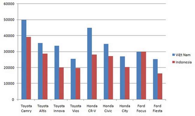 Bảng phía dưới so sánh mức giá các dòng xe phổ biến tại Việt Nam và Indonesia, đây là phiên bản thấp nhất của mỗi mẫu xe, theo giá đề xuất trên website chính thức của các hãng sản xuất. Biểu đồ cho thấy khoảng cách giá cả giữa các dòng xe là không đồng nhất, tùy thuộc vào chính sách giá của mỗi hãng, nhưng không có dòng xe nào giá ở Việt Nam rẻ hơn Indonesia.