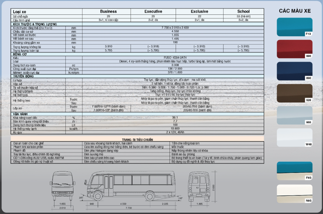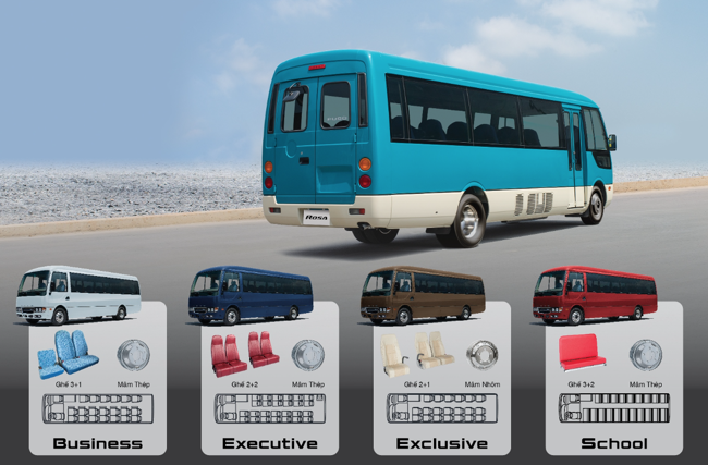 Tai thị trường Việt Nam, thương hiệu FUSO giới thiệu đến quý khách hàng 4 phiên bản xe buýt ROSA: phiên bản Business 29 chỗ (ghế 3+1), phiên bản Executive 29 chỗ (ghế 2+2), phiên bản Exclusive 22 chỗ (ghế 2+1) và phiên bản School 53 chỗ dành cho trẻ em.