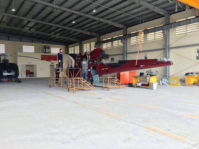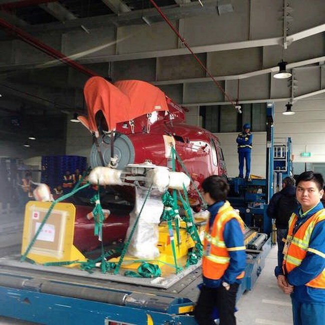 Hình ảnh chiếc trực thăng dân dụng xuất hiện tại cảng hàng không Nội Bài đang được bộ phận kỹ thuật kiểm tra lắp ráp lại sau chặng đường bay dài.