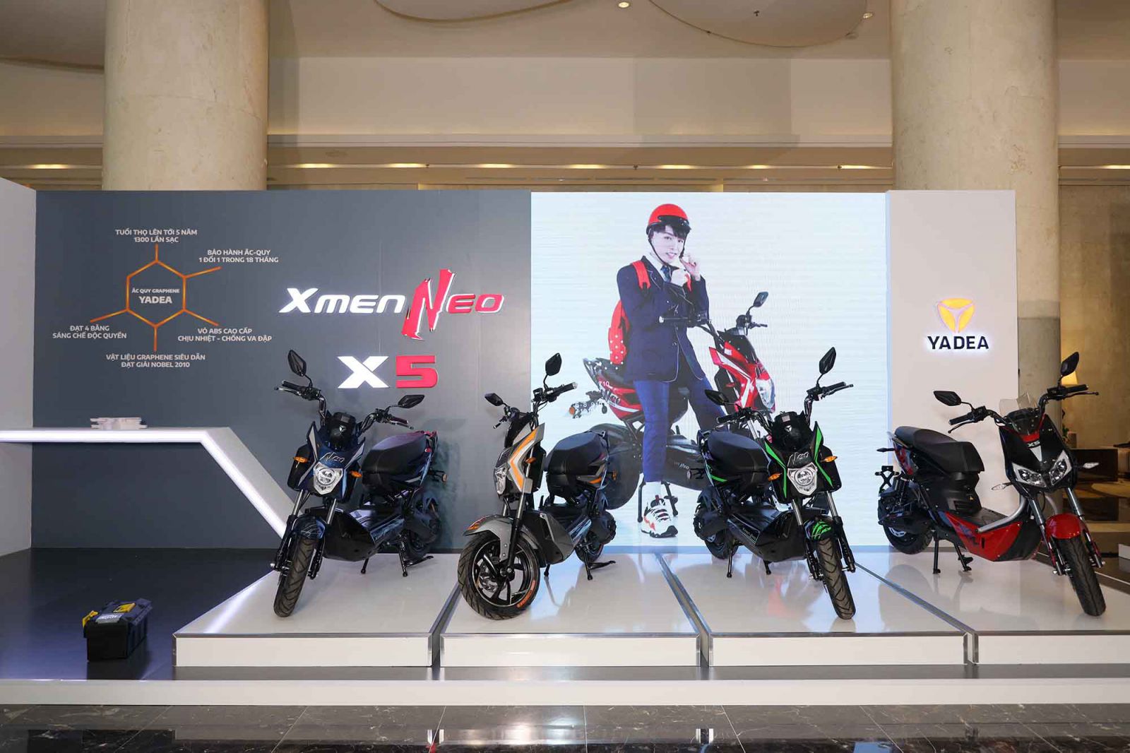 Cùng với Xmen Neo, YADEA cũng giới thiệu mẫu xe X5 dành cho đối tượng khách hàng muốn tìm một mẫu xe máy điện cỡ lớn hơn. X5 được trang bị hệ thống giảm xóc upside down ở phía trước, giảm xóc đôi khí nén thuỷ lực ở phía sau và động cơ GTR 1.200 watt giúp di chuyển quãng đường 90 km trên mỗi lần sạc.