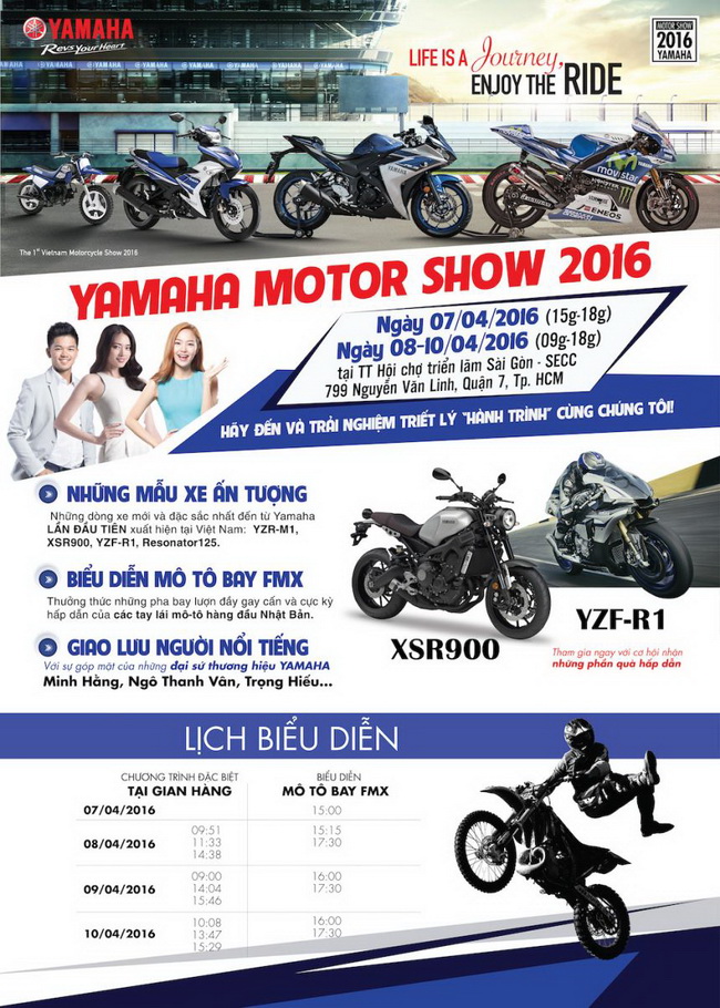 Yamaha cũng là nhà trưng bày có tổng diện tích sử dụng lớn nhất trong triển lãm lần này với hơn 2100m2 gồm 05 không gian trưng bày bao gồm những siêu phẩm đã làm nên tên tuổi cho hãng xe danh tiếng của mình: siêu mô-tô huyền thoại YZR-M1 đã mang lại cho Yamaha 7 chức vô địch thế giới MotoGP, Grande luxury concept, XSR900 cùng nhiều mẫu xe concept độc đáo sẽ được hé lộ tại sự kiện. Đây là cơ hội hiếm có cho giới mộ điệu và công chúng để thưởng lãm những mẫu xe lần đầu tiên xuất hiện ở Việt Nam.